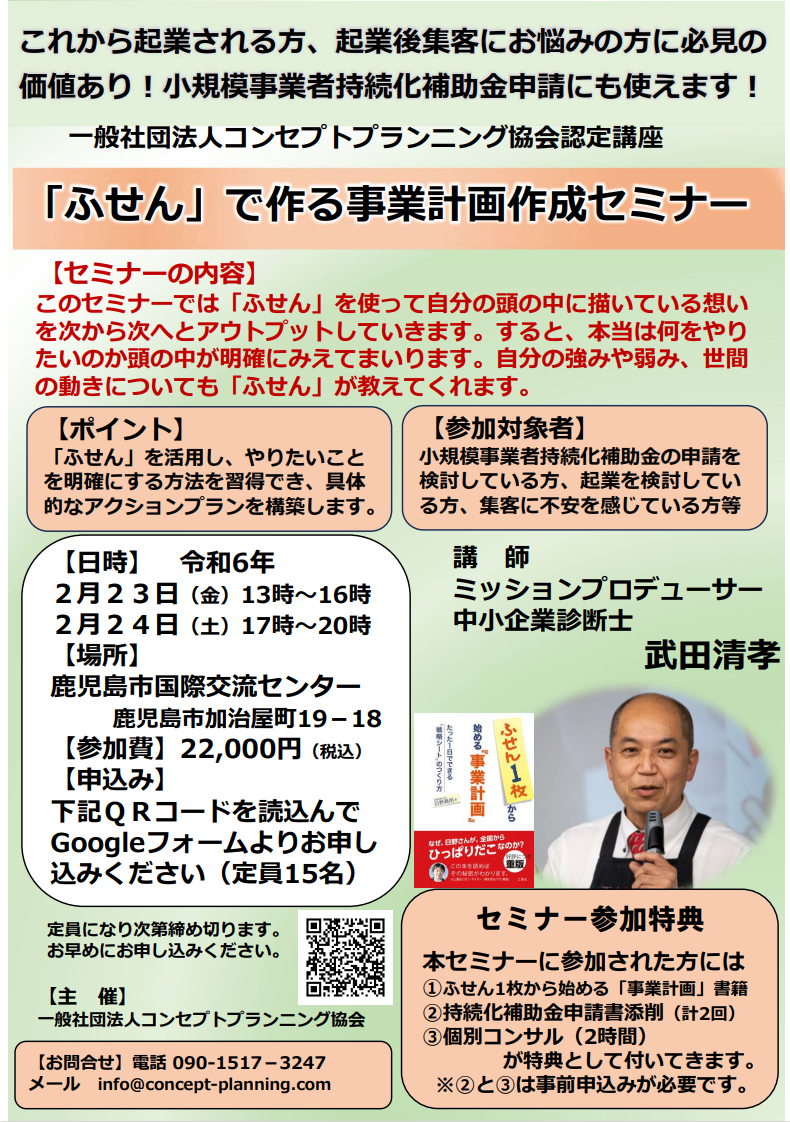 その他 小規模持続化補助金セミナー 2月に小規模事業者持続化補助金申請予定者に向けて、事業計画作成セミナーを開催いたしました。 セミナー・講座レポート 売れぜんセミナー(鹿児島) 社長の出口戦略入門セミナー